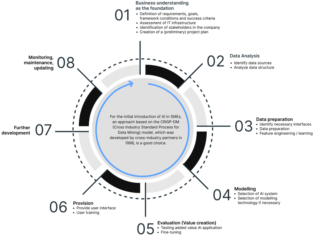 For the initial introduction of AI in SMEs, DGKI utilizes an approach based on the CRISP-DM (Cross Industry Standard Process for Data Mining) model, which was developed by cross-industry partners in 1996. As with any model, it is essential to remain flexible and agile in order to take into account both the individuality of an organization and the individual framework conditions of the implementation.